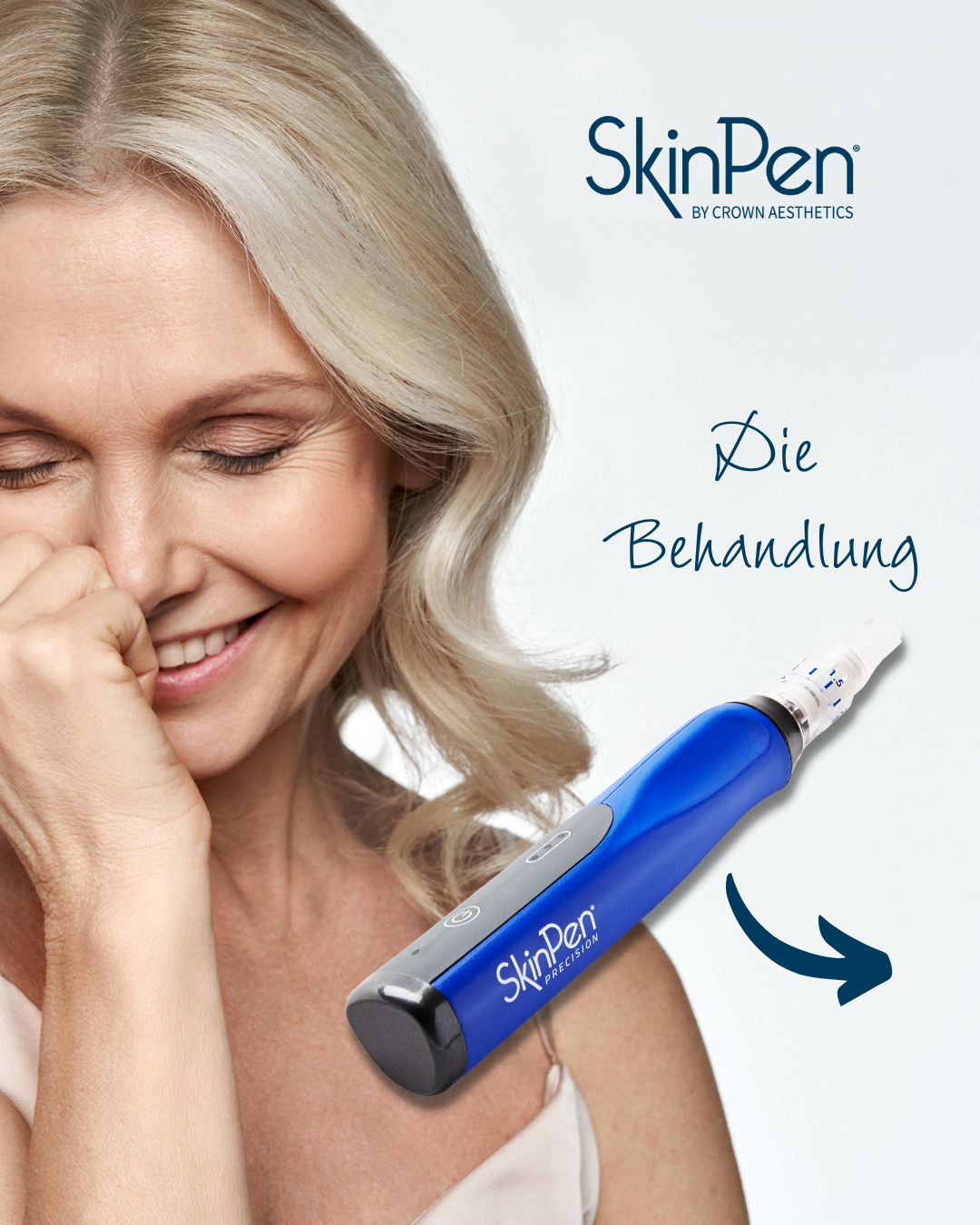 Die Behandlung selbst erfolgt mit dem SkinPen Precision. Das Gerät wird sanft und gleichmäßig über die Haut geführt und setzt präzise Mikrokanäle, um die körpereigenen Regenerationsprozesse anzuregen. Die Behandlung kann in manchen Bereichen als leicht unangenehm empfunden werden – sollte es zu Schmerzen kommen, kann die Eindringtiefe individuell angepasst werden.